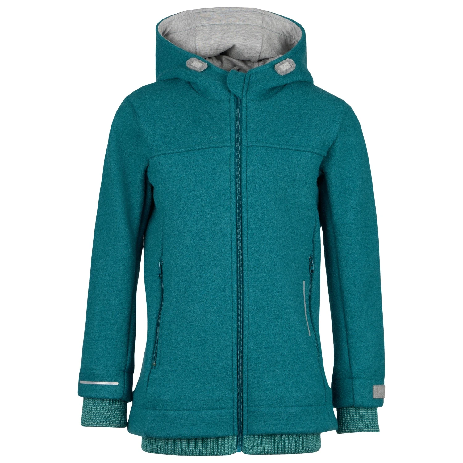 La doublure est en coton bio et durable, tandis que le tissu extérieur est en laine mérinos naturelle et douce, difficile de faire mieux ! Ce mélange est vraiment confortable. La veste est préformée au niveau du haut du corps et des bras, ce qui assure un ajustement idéal. La coupe légèrement plus longue, inspirée de la coupe « High Reach » utilisée en escalade, est particulièrement pratique pour empêcher la veste de trop remonter lorsque l’enfant tend les bras. Ainsi, le haut du corps reste bien au chaud à chaque mouvement. Les deux poches avant, les bandes réfléchissantes et la grande capuche avec cordon de serrage complètent le tout !