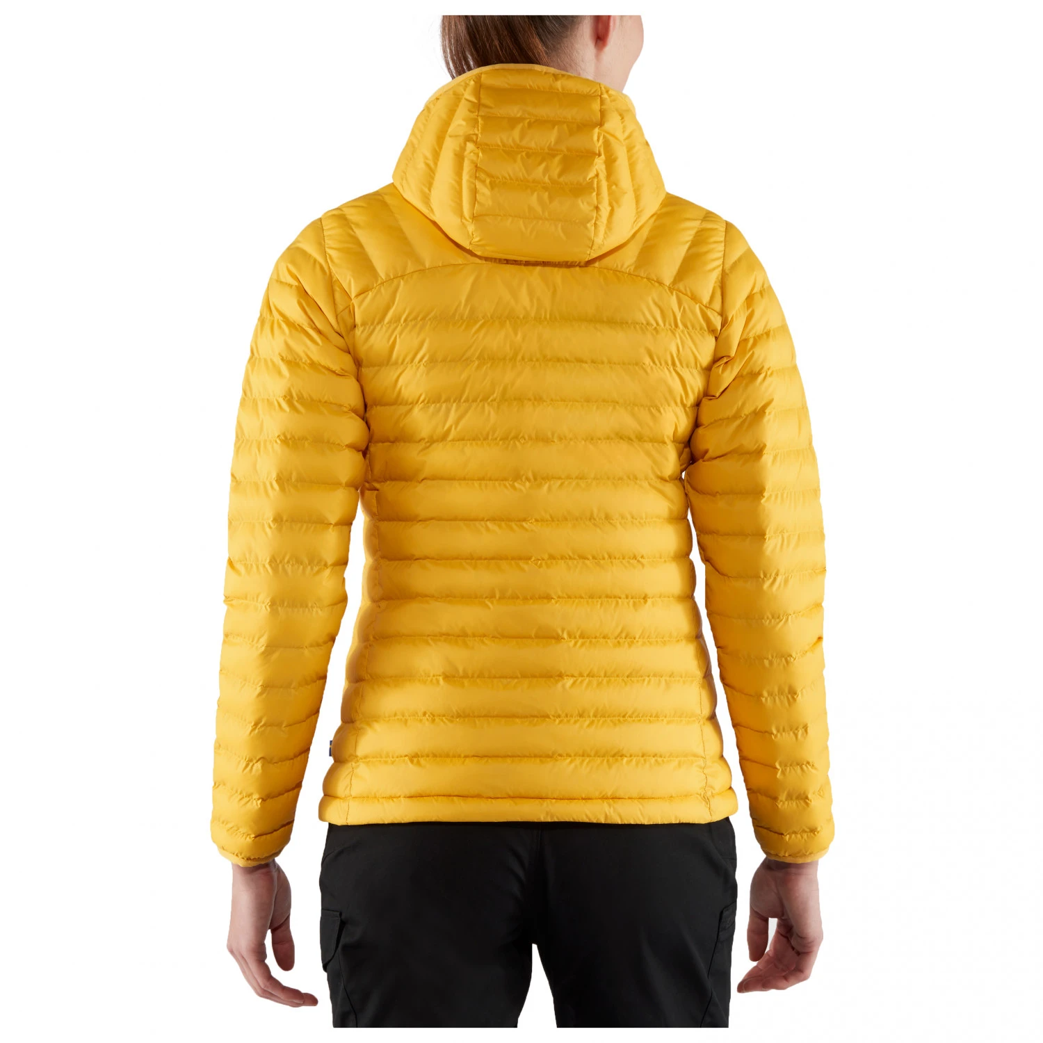 Grâce à la taille souple avec cordon de serrage, la doudoune Women’s Expedition Lätt Hoodie de la marque Fjällräven est bien ajustée et ne remonte pas pendant une randonnée.
