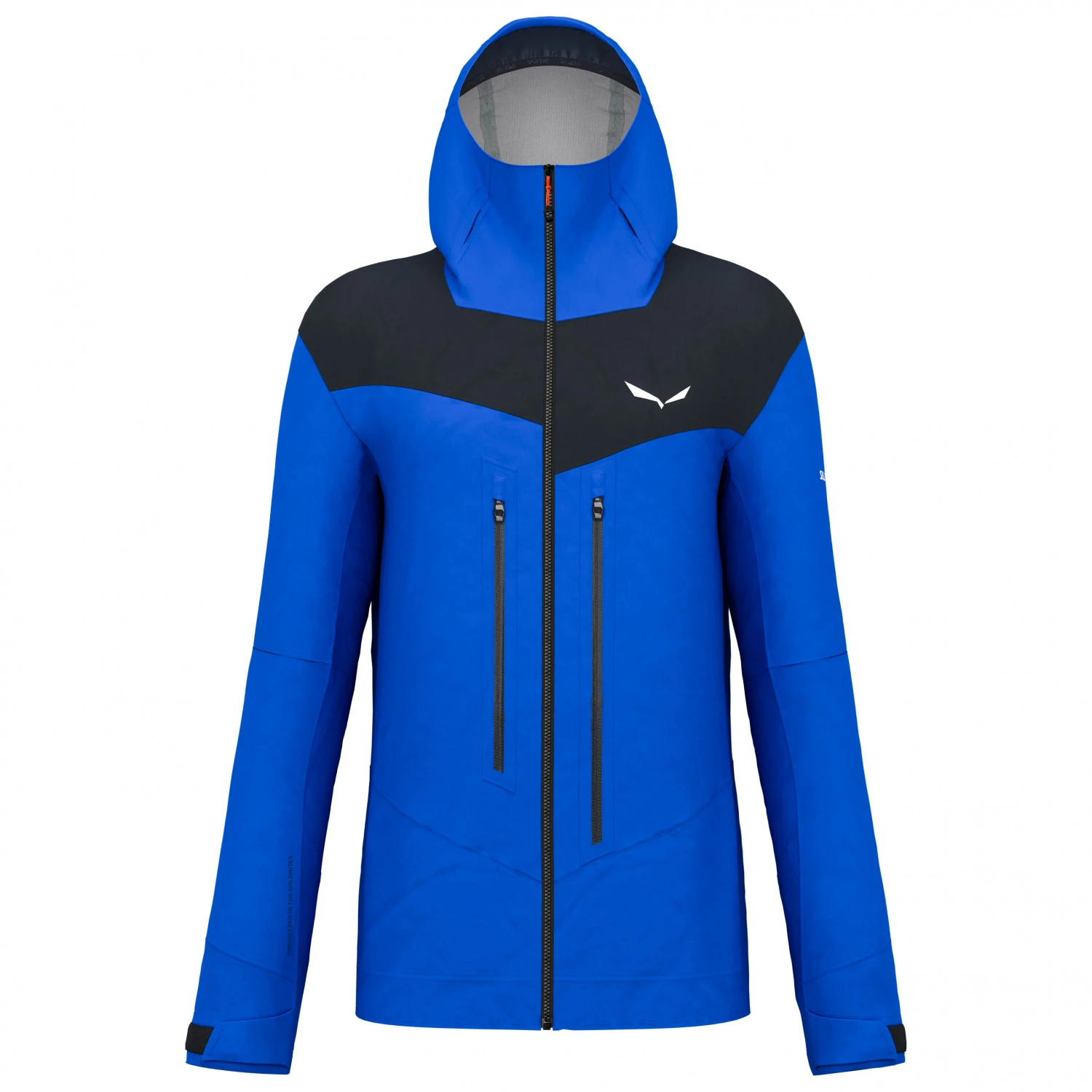 La capuche peut être portée sans problème sous un casque. D’ailleurs, elle comporte des ouvertures à travers lesquelles vous pourrez passer la jugulaire, pour qu’elle ne glisse pas sous le casque. La construction spéciale sous les bras procure une bonne liberté de mouvement. La poche sur la poitrine permet d’accéder à la couche inférieure de vêtements. Le modèle Ortles est super pour les activités en terrain alpin !
